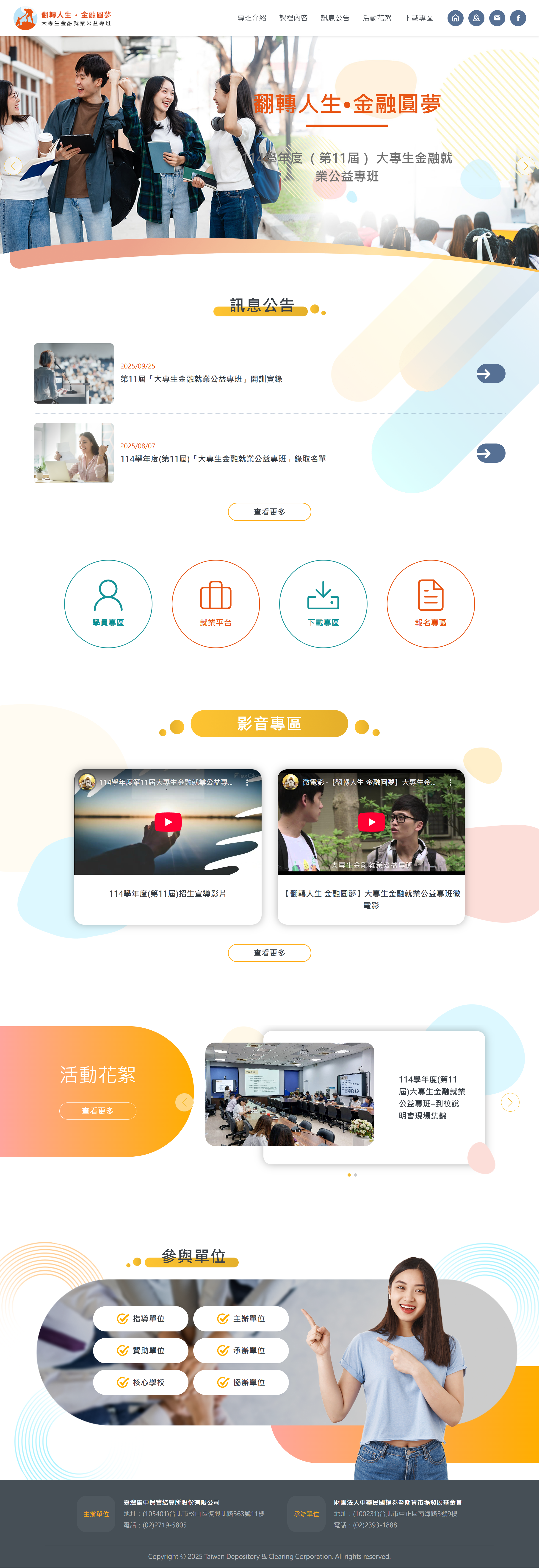 大專生金融就業公益專班 由 臺灣集中保管結算所 主辦,邀集金融機關共同贊助。阡益資訊 受託開發全方位管理平台,支援跨年度的行政作業與數據統計。